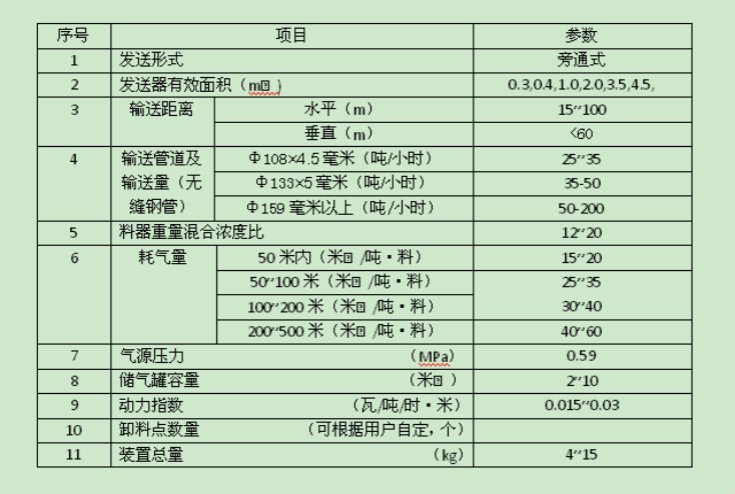 ZSP系列旁通式氣力輸送系統主要技術參數:
